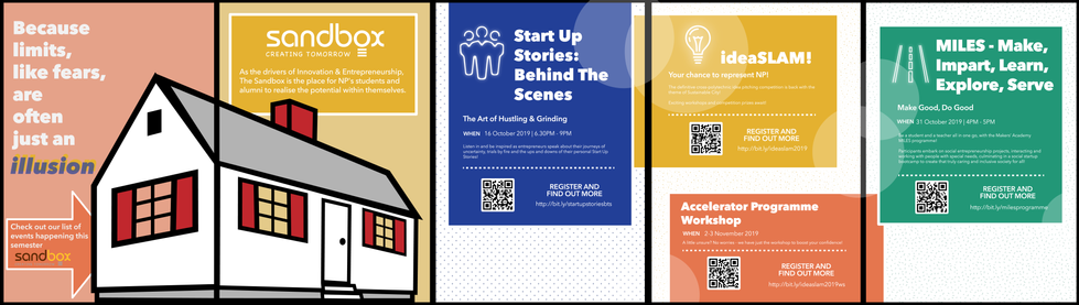 Brochure for The Sandbox @ NP displaying various event advertisements and colorful event posters with text and graphics.